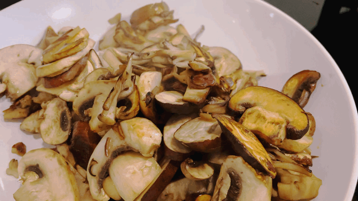 - Add 1 tbsp of olive oil to the frying pan and fry one third of the mushrooms until they are golden brown. Transfer them to a plate and salt them lightly. Don’t be too heavy handed with the salt… you can always add more later. Repeat this step with the remaining mushrooms then set all the cooked mushrooms aside.